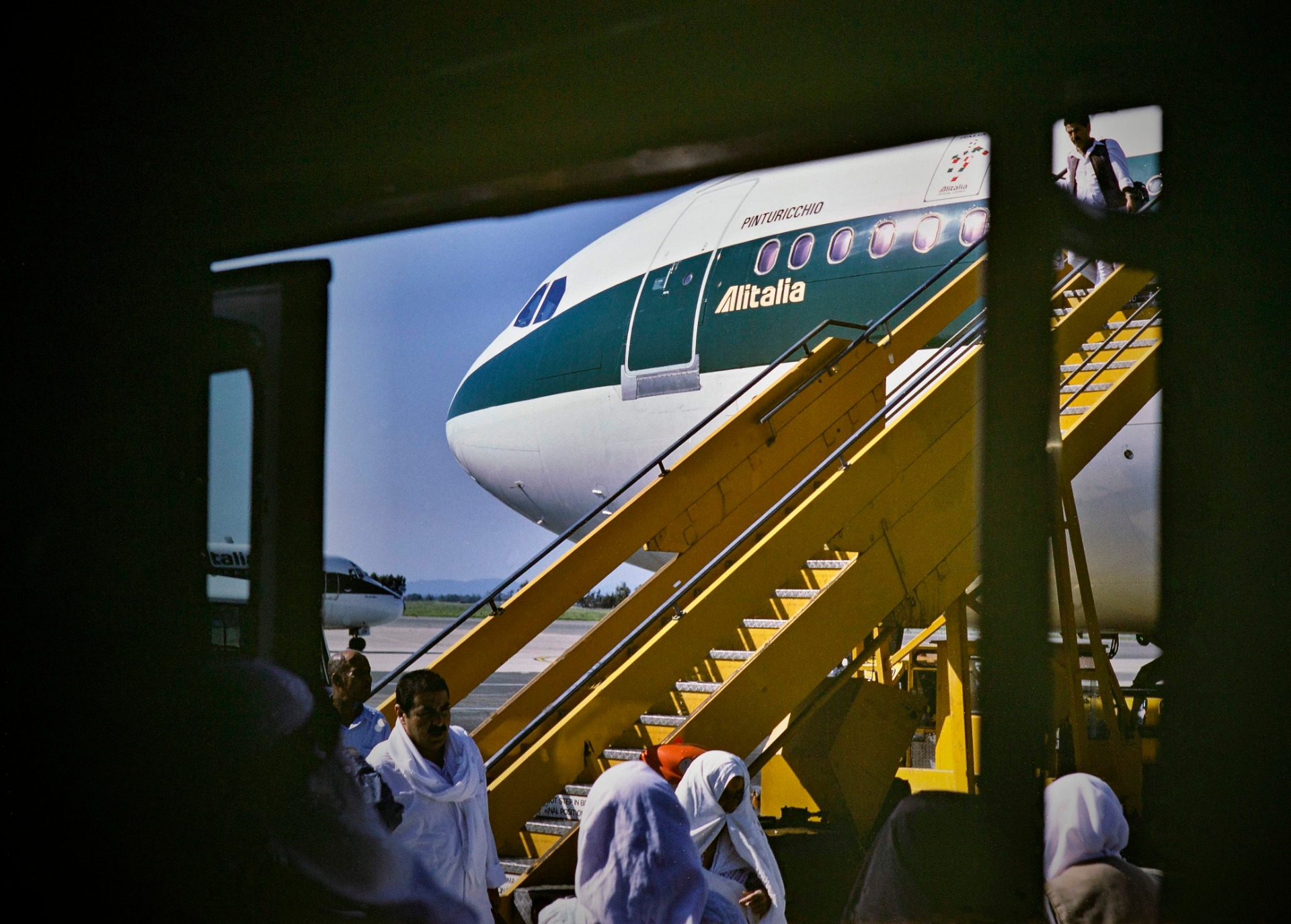 Zpáteční let nebudu popisovat tak barvitě, jako to bylo, když jsme stejnou cestu absolvovali na sklomku roku 1988 v opačném směru. Po odletu z Addis bylo letadlo víc než poloprázdné a tak jsme si užívali pohledy na Ethiopskou vysočinu i přelet přes Rudé moře každý u jiného okénka. . Za hodinku už jsme nalétali na přistávací dráhu v Jiddah. Opět zaznělo výhružné upozornění ohledně zákazu kouření a pití alkoholu. Přistáli jsme hladce, italští piloti jsou machři. Zarolovali jsme na naše místo a machři vypli klimatizaci. Asi to byl taky zákaz ve jménu proroka Mohameda, aby potrápil bezvěrce, zvláště ty, kteří měli tu drzost nevěřit v žádného boha. V letadle během čtvthodiny začala stoupat teplota do obtížně snesitelných výšek. Nic se nedělo, ani letušky se neukázaly a po hodině, kdy v kabině už muselo být snad kolem sedmdesáti. Teprve po této pro nás nekonečné době jsme zahlédli tři autobusy, které se váhavě blížily k mám. Z nich - ještě teď se klepu, když si na to vzpomenu - vystoupil dav lidí zahalených v bílých prostěradlech a zanedlouho zaplnili vnitřek letadla do posledního místa. Klimatizace se najednou spustila a my jsme se zaradovali, že jsme celou dobu bezklimatizační ve zdraví přežili. Poutníci se vraceli z haddže, poutě do Mekky, největší náboženské slavnosti mohamedánů. Jak ti lidé vypadali je vidět i z obrázku. Byl jsem obklopen zahalenými bytostmi, které nereagovaly na žádný kontakt. Když jsem si však zapálil, ozval se z pod prostěradla nespokojené mručení a to mě vybídlo, abych svoji činnost opa koval co nejčastěji. Holandská letuška nás zásobila plechovkami piva, které jí zbývaly, protože muslimům je alkohol od proroka zakázán.