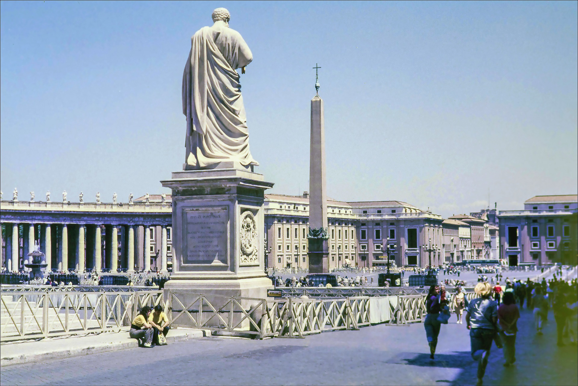 Kde se vzal obelisk uprostřed vatikánského náměstí ? O tom máme docela podrobné zprávy, vlastně více zpráv. Podle jedné verze byl původně z páté dynastie egyptkých králů a vztyčil ji dnes neznámý vládce. Je pravda, že v tomto časovám úseku dějin země na Nilu panovali tzv. sluneční králové, kteří si na zhotovování obelisků a slunečních chrámů potrpěli. Stával v Onu, posvátném městě, kde byl uctíván sluneční bůh Re a nacházelo se na území káhirké čtvrti Heliopolis. Císař Augustus jej přemístil do přístavu v Alexandrii a v roce 41 na příkaz bláznivého císaře Caliguly byl dopraven do Říma a postaven v jeho amfiteátru, Podle druhé verze byl vytesán až v Caligulově době a vztyčen byl ve Věčném městě až za vlády pomateného kruťase Nerona. Podle další verze na jeho vrcholu byla umístěna urna s Ceaserovým popelem. Tohle asi bude pouhá smyšlenka - Caesarovy ostatky v té době byly už osmdesát let uloženy v jeho vlastním mauzoleu na druhém břehu řeky Tibery. Po zániku římské říše byl stále na původním místě až do 16. století.